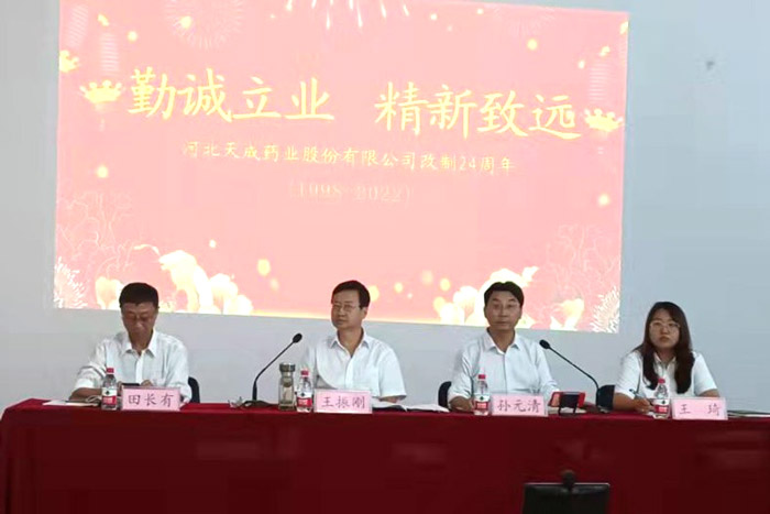 金秋送爽、丹桂飘香,又是一年丰收季,在满载收获的时节,我们即将迎来国庆节和党的二十大。在这喜悦的时刻,天成药业迎来企业改制24周年纪念日。9月30日下午,公司在三分厂会议室举行了公司改制24周年庆祝大会。九游官网_九游jiuyou(中国)董事长王振刚、天成药业总经理、渤海分公司总经理孙元清、天成药业副总经理、渤海分公司常务副总经理田长有 、天成药业常务副总经理王琦出席会议,天成药业、道恩药业全体中层及以上干部,全体科室后勤人员现场参会,渤海分公司、天津应天成科技有限公司全体不能到现场的人员通过视频链接网上参会。会议由总经理孙元清主持。