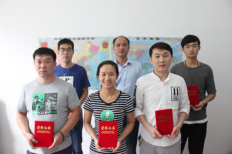 优秀员工与领导合影:(后排从左向右)高杰、王颢(常务副总)、李炳盈;(前排从左向右)王越、李海玲、王帅