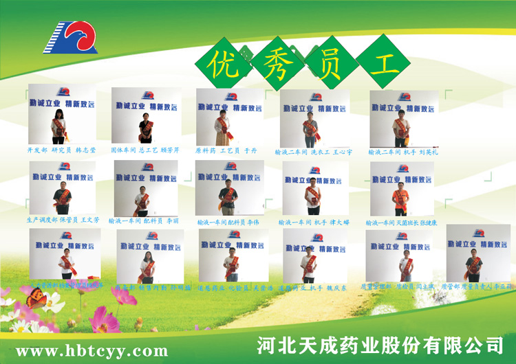 7 张健康 输液一车间 灭菌班长 他踏实肯干,服从领导安排,积极工作,主动带新人,在组成的新班验证阶段起到了模范带头作用。